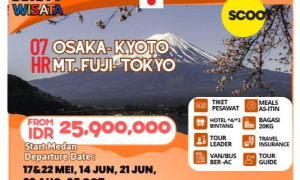 HARI 01 : MEDAN – OSAKA (B) Hari ini kita berkumpul di Bandara KUALANAMU untuk berangkat menuju Osaka Bermalam di pesawat Hari 02: OSAKA – KYOTO – OSAKA (B) Setelah sampai di Jepang, kita akan disambut guide yang ramah, setelah itu anda akan langsung diajak untuk mengunjungi Fushimi Inari yang merupakan kuil Shinto dan juga kuil pusat bagi sekitar 40.000 kuil Inari yang memuliakan Inari. Terakhir kita akan mengunjingi Kiyomizu Temple/Kinkakuji Temple (DEPENDS ON SITUASION) yang merupakan kuil Budha kuno yang dibangun sejak tahun 798 dan mengalami 10 kali kerusakan akibat perang dan bencana alam. Kemudian kita akan melakukan perjalanan ke Gifu, Check-in hotel istirahat Hari 03: OSAKA – TOKYO (B) Siap sarapan, mengunjungi OSAKA Castle, Kuramon Fish Market, Shinsaibashi – Dotonburi yang merupakan daerah pusat perbelanjaan yang iconic dengan papan iklan glico mannya. Kemudian, naik Shinakanshen menuju TOKYO. Bermalam di TOKYO. Hari 04: MT.FUJI- TOKYO (B) Setelah santap pagi. Kita akan mengunjungi area Gunung Fuji yang merupakan gunung terindah dan tertinggi di Jepang, Setelah itu kita akan berkesempatan berbelanja di Gotemba Premium Outlet. Kemudian, kita akan menuju Lake Kawaguchi di sini kita dapat bersantai sambil berswafoto dengan pemandangan Gunung Fuji yang indah. Check-in hotel istirahat. Hari 05: TOKYO CITY TOUR-DEPARTURE (B) Setelah santap pagi, kita akan menuju Asakusa disini kita dapat berbelanja dan shopping di area keramaian yang favorit di Jepang dan Photoshop di Tokyo Sky Tree. Setelah itu kita akan menuju Odaiba disini terdapat monument robot transformer yang sangat besar ataupun patung liberty Jepang. Bermalam di pesawat Hari 06: TOKYO FREE DAY – KUALALUMPUR by FLIGHT (B) Setelah sarapan, hari ini anda dapat bebas menjelajah kota Tokyo seharian (NO BUS, NO GUIDE). Kemudian malam Anda akan diantar ke airport keberangkatan menuju kualanamu. Transit di Kualalumpur. Bermalam di Peswat. Hari 07: TOKYO DEPARTURE (B) Melanjutkan penerbangan menuju kota asal. SELESAI. Terima kasih semoga berjumpa kembali di perjalanan SETIA WISATA berikutnya.